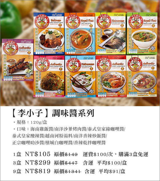 | 李小子-調味醬系列-新加坡在地美味直送!好的調味醬讓您烹調更輕鬆,濃郁夠味的異國風情,讓您盡情發揮創意,做出專屬料理平均每盒最低只要91元起(3盒免運)即可購得【李小子】調味醬系列1盒/3盒/9盒(1 售價:91 我要購買 |