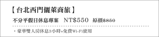 | 台北西門儷萊商旅-不分平假日休息專案-交通超便利!舒適的環境,如同在家般自在,僅3分鐘路程的西門町,是年輕人的朝聖天堂!輕鬆暢遊台北城只要550元(雙人價)即可享【台北西門儷萊商旅】原價850元不分平 售價:550 我要購買 |
